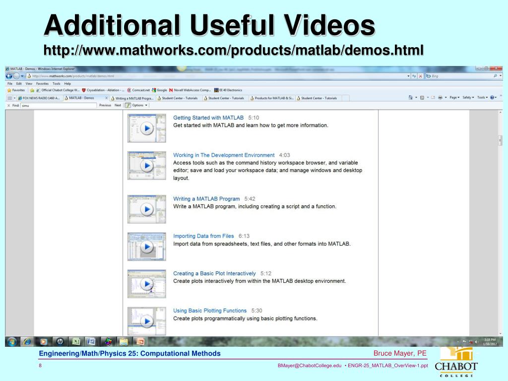 Additional Useful Videoshttp://www.mathworks.com/products/matlab/demos.html