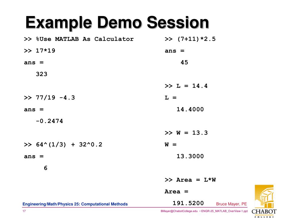 Example Demo Session >> %Use MATLAB As Calculator >> 17*19 ans = 323 >> 77/19 -4.3 ans = -0.2474 >> 64^(1/3) + 32^0.2 ans = 6 >> (7+11)*2.5 ans = 45 >> L = 14.4 L = 14.4000 >> W = 13.3 W = 13.3000 >> Area = L*W Area = 191.5200
