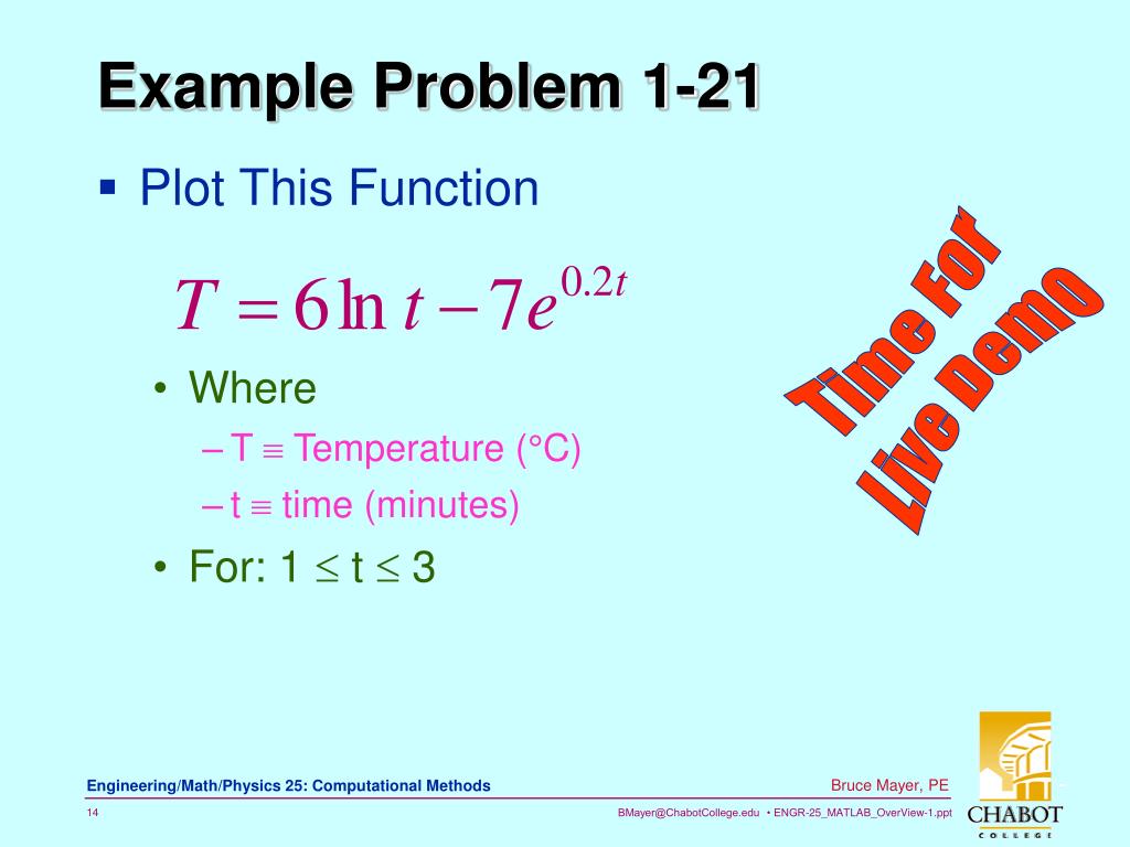 Example Problem 1-21 • Plot This Function Time For Live Demo • Where • T Temperature (°C) • t time (minutes) • For: 1 t 3