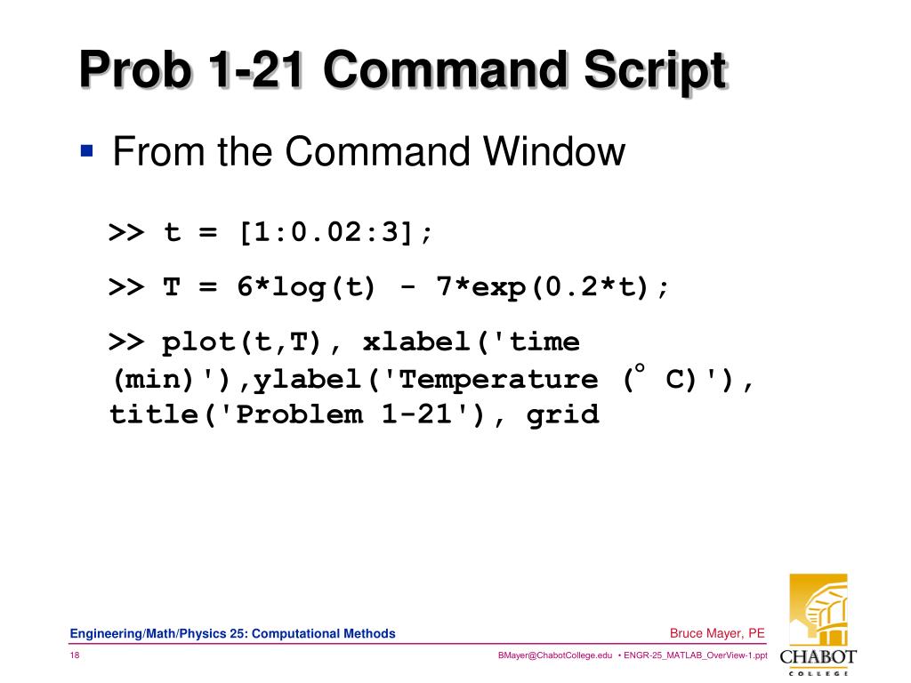 Prob 1-21 Command Script • From the Command Window >> t = [1:0.02:3]; >> T = 6*log(t) - 7*exp(0.2*t); >> plot(t,T), xlabel('time (min)'),ylabel('Temperature (°C)'), title('Problem 1-21'), grid