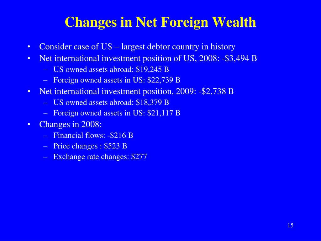 Changes in Net Foreign Wealth • Consider case of US – largest debtor country in history • Net international investment position of US, 2008: -$3,494 B • US owned assets abroad: $19,245 B • Foreign owned assets in US: $22,739 B • Net international investment position, 2009: -$2,738 B • US owned assets abroad: $18,379 B • Foreign owned assets in US: $21,117 B • Changes in 2008: • Financial flows: -$216 B • Price changes : $523 B • Exchange rate changes: $277