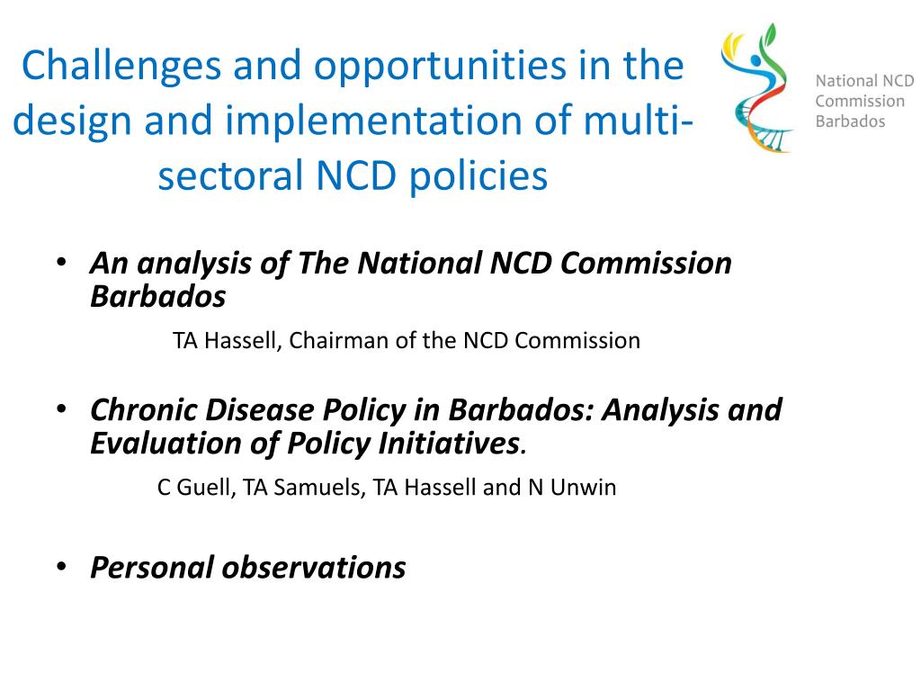 Challenges and opportunities in the design and implementation of multi-sectoral NCD policies • An analysis of The National NCD Commission Barbados TA Hassell, Chairman of the NCD Commission • Chronic Disease Policy in Barbados: Analysis and Evaluation of Policy Initiatives. C Guell, TA Samuels, TA Hassell and N Unwin • Personal observations