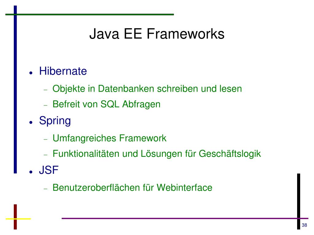 Java EE Frameworks • Hibernate • Objekte in Datenbanken schreiben und lesen • Befreit von SQL Abfragen • Spring • Umfangreiches Framework • Funktionalitäten und Lösungen für Geschäftslogik • JSF • Benutzeroberflächen für Webinterface