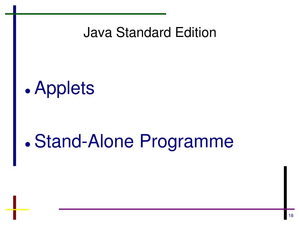 Applets • Eigenständige Programme in HTML Seiten eingebettet • Ende 1990 Hauptgrund für schnelle Verbreitung von Java • Browser muss eine Virtuelle Maschine haben