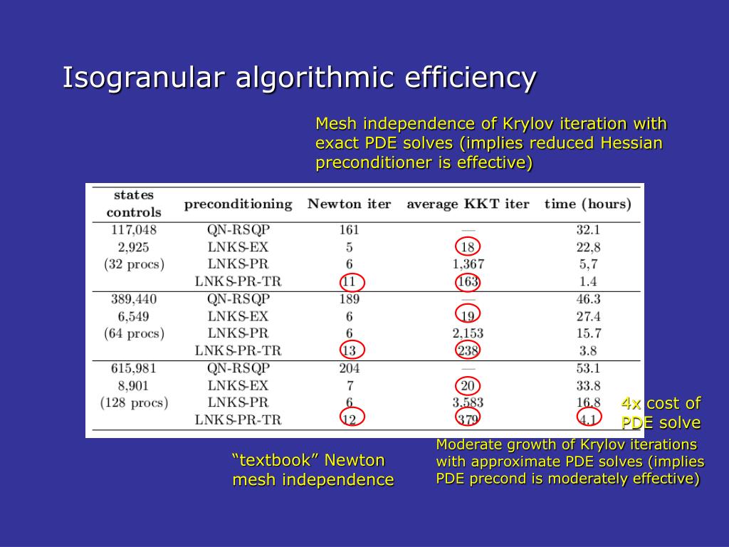 Mesh independence of Krylov iteration with exact PDE solves (implies reduced Hessian preconditioner is effective) 4x cost of PDE solve Moderate growth of Krylov iterations with approximate PDE solves (implies PDE precond is moderately effective) “textbook” Newton mesh independence Isogranular algorithmic efficiency
