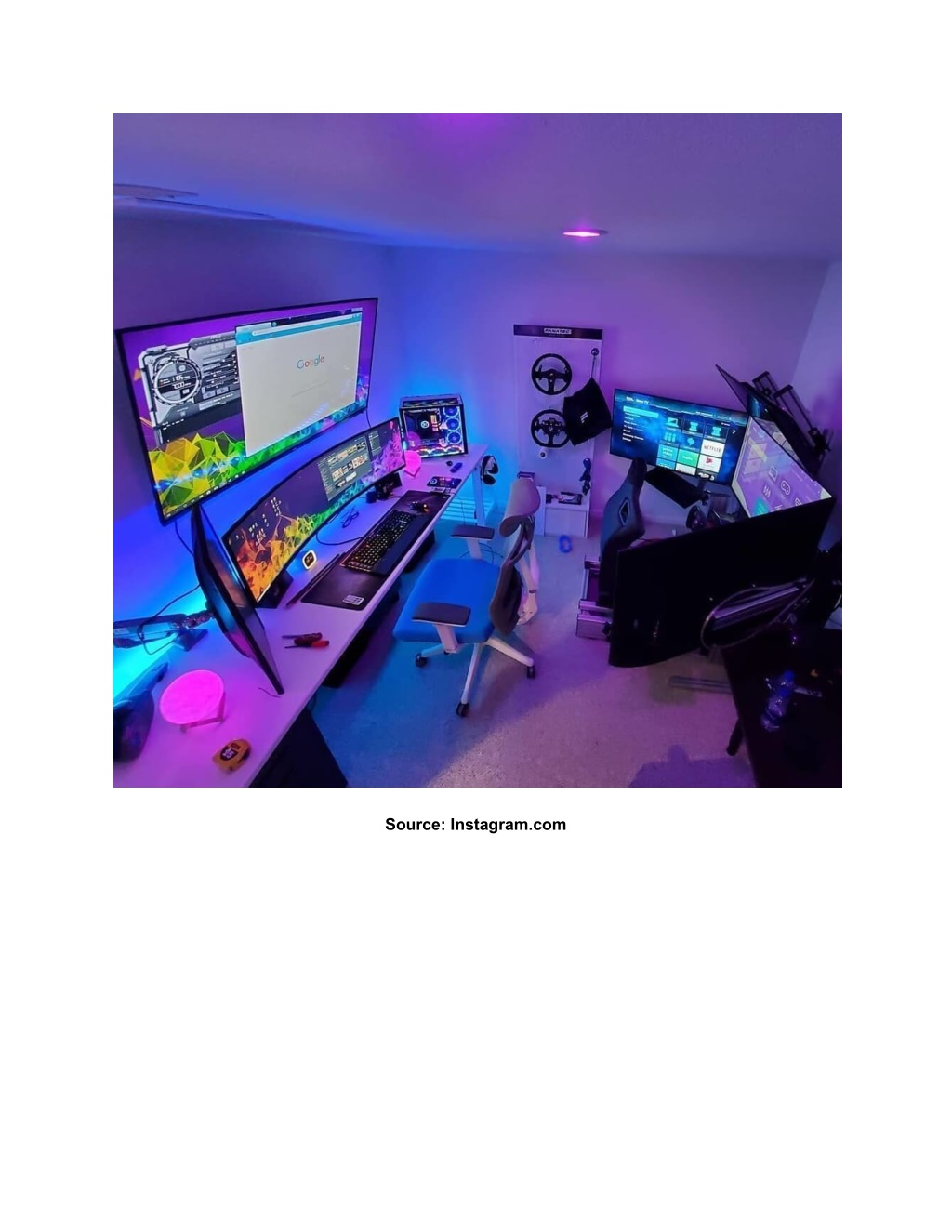 This setup is all about filling the room with the correct gaming peripherals. It is not an easy task to establish such a setup, but if you have many hardware and gaming consoles, this should give you a practical sense of how to fill the room appropriately. Specifications: ● ● ● ● ● ● ● ● ● Processor: Intel Core i7-7700K NZXT Kraken X62 Cooler is the CPU cooler. RAM: 32GB (16GB x 2) G.Skill Trident Z RGB DDR4 3200 RAM. SSD: Samsung NVME M.2 512GB SSD 3TB hard drive Power supply: Corsair RM850x Platform: ASUS STRIX Z270E GAMING Platform Situation: Corsair 570X HUE+ Lighting by NZXT Peripherals: ● ● ● ● ● ● ● ● ● ● ● ● ● ● ● ● Monitor: ASUS ROG SWIFT PG348Q Monitor, Benq ZOWIE XL2730 ROG SWIFT PG279Q by Asus 65-Inch OLED 4K TV from LG 2.1-Channel Wireless Sound Bar, LG SH5, 320W 130 Watt Wireless Sound Bar with Active Subwoofer from Samsung Speaker JBL Flip 4 Bluetooth BlackWidow Chroma V2 keyboard by Razer Gaming Mouse, Razer Mamba Tournament Edition Naga Hex V2 Gaming Mouse from Razer Kraken Pro V2 by Razer (The PewDiePie Headset) Wireless Headset + Base Station ASTRO Gaming A50 Second-generation Focusrite Scarlett Solo audio interface Satin Red Blue Yeti USB Microphone Chair for DXRacer Gamers’ Alpha Chair