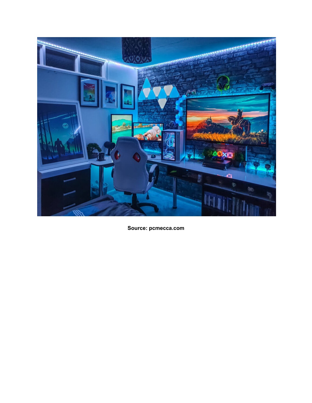 14. Less is More Gaming Space Source: whatifgaming.com The setup features a two-monitor PC gaming setup with a white and grey aesthetic. The balance is perfect; the 3D and solid wall in the background give more depth to the room. Specifications: ● ● ● ● ● ● ● NVIDIA RTX 3060TI Galax 32GB RAN Gaming ROG STRIX X570 Dynamic Lian-Li 011 Unifans SL 120 X9 by Lian-Li 1TB SSD Samsung 970 EVO 2TB Seagate Barracuda HDD Peripherals: ● ● ● ● ● ● ● ● ● ● ● Eris 3.5 Near Field Studio Monitor by Presonus 34-inch 144-Hz IPS gaming monitor Bezel 34HX270-S 24′′ 165Hz Full HD ASUS TUF Gaming VG259QR Monitor ROG Strix Go Core Moonlight from ASUS Wireless FPS gaming mouse from ASUS ROG ROG Strix Impact II Gaming Mouse from Asus Heavy-duty microphone stand with suspension boom arm from ONAIR Wave 3 Elgato Streamdeck by Elgato AX310 from AverMedia Nexus Live Streamer Mechanical Keyboard with RGB Gateron Switch by GamaKay