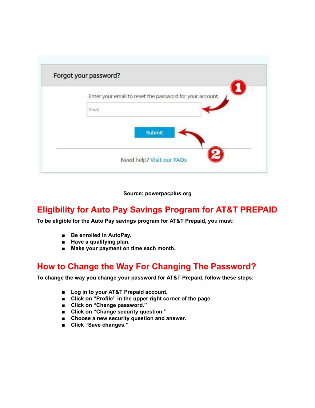 Source: powerpacplus.org Eligibility for Auto Pay Savings Program for AT&T PREPAID To be eligible for the Auto Pay savings program for AT&T Prepaid, you must: ■ ■ ■ Be enrolled in AutoPay. Have a qualifying plan. Make your payment on time each month. How to Change the Way For Changing The Password? To change the way you change your password for AT&T Prepaid, follow these steps: ■ ■ ■ ■ ■ ■ Log in to your AT&T Prepaid account. Click on “Profile” in the upper right corner of the page. Click on “Change password.” Click on “Change security question.” Choose a new security question and answer. Click “Save changes.”