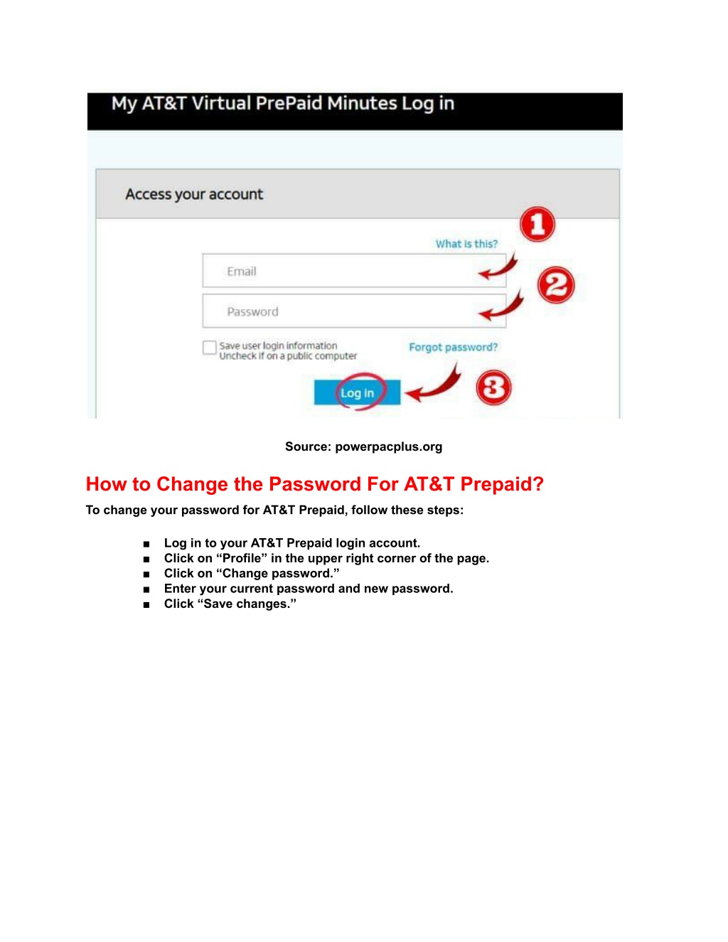 Source: powerpacplus.org How to Change the Password For AT&T Prepaid? To change your password for AT&T Prepaid, follow these steps: ■ ■ ■ ■ ■ Log in to your AT&T Prepaid login account. Click on “Profile” in the upper right corner of the page. Click on “Change password.” Enter your current password and new password. Click “Save changes.”