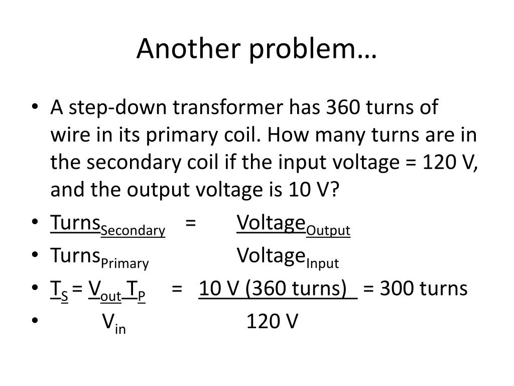 Another problem… • A step-down transformer has 360 turns of wire in its primary coil. How many turns are in the secondary coil if the input voltage = 120 V, and the output voltage is 10 V? • TurnsSecondary = VoltageOutput • TurnsPrimaryVoltageInput • TS= Vout TP = 10 V (360 turns) = 300 turns • Vin 120 V