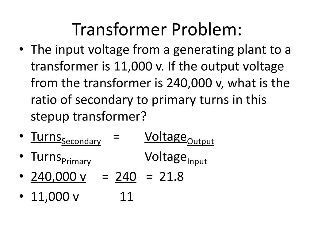 Transformer Problem: • The input voltage from a generating plant to a transformer is 11,000 v. If the output voltage from the transformer is 240,000 v, what is the ratio of secondary to primary turns in this stepup transformer? • TurnsSecondary = VoltageOutput • TurnsPrimaryVoltageInput • 240,000 v = 240 = 21.8 • 11,000 v 11