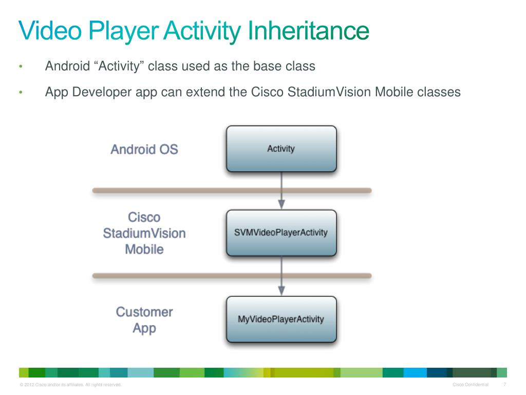 Video Player Activity Inheritance • Android “Activity” class used as the base class • App Developer app can extend the Cisco StadiumVision Mobile classes