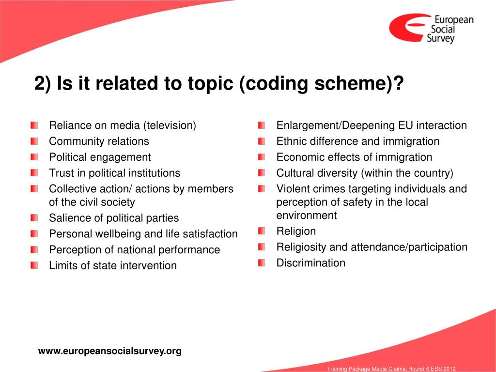 2) Is itrelated to topic (coding scheme)? • Reliance on media (television) • Community relations • Political engagement • Trust in political institutions • Collective action/ actions by members of the civil society • Salience of political parties • Personal wellbeing and life satisfaction • Perception of national performance • Limits of state intervention • Enlargement/Deepening EU interaction • Ethnic difference and immigration • Economic effects of immigration • Cultural diversity (within the country) • Violent crimes targeting individuals and perception of safety in the local environment • Religion • Religiosity and attendance/participation • Discrimination