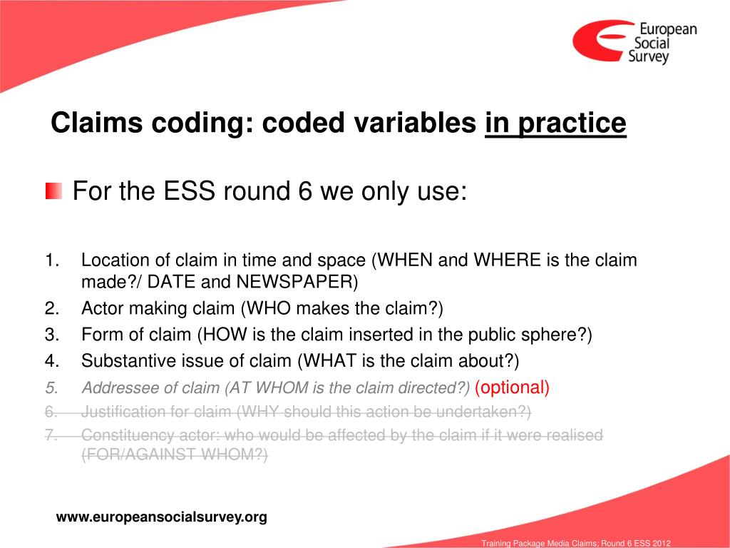 Claims coding: coded variables in practice • For the ESS round 6 we onlyuse: • Location of claim in time and space (WHEN and WHERE is the claim made?/ DATE and NEWSPAPER) • Actor making claim (WHO makes the claim?) • Form of claim (HOW is the claim inserted in the public sphere?) • Substantive issue of claim (WHAT is the claim about?) • Addressee of claim (AT WHOM is the claim directed?) (optional) • Justification for claim (WHY should this action be undertaken?) • Constituency actor: who would be affected by the claim if it were realised (FOR/AGAINST WHOM?)