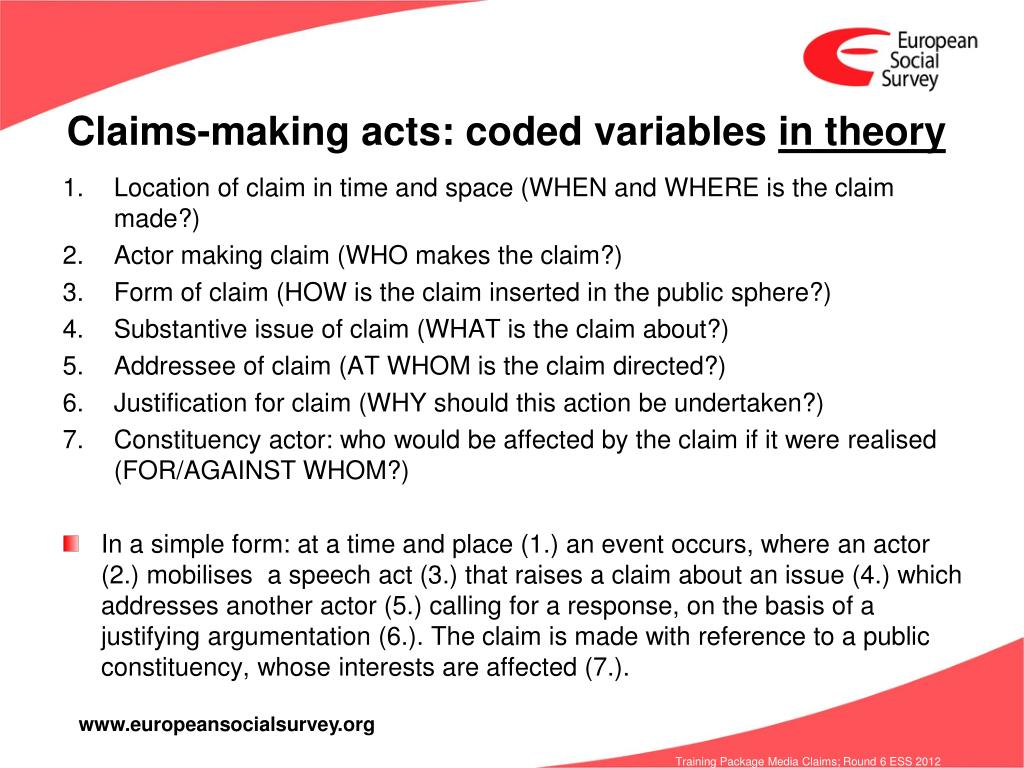 Claims-making acts: ‘claims’ definition The unit of analysis for capturing the ideological contents is a ‘claims-making act’ or ‘claim’. This is a strategic action in the public sphere. It consists of intentional public speech acts which articulate political demands, calls to action, proposals, and criticisms, which, actually or potentially, affect the interests or integrity of claimants and/or other collective actors in a specific issue-field.