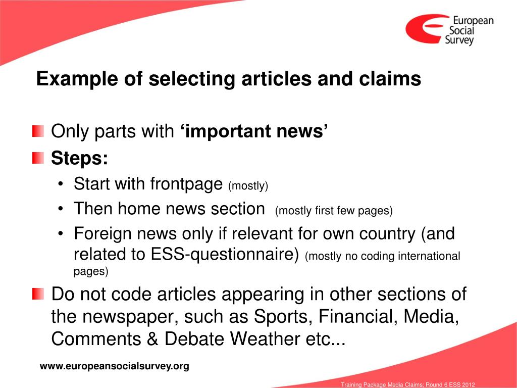 Example of selectingarticles and claims • Onlypartswith‘important news’ • Steps: • Start withfrontpage(mostly) • Then home newssection(mostlyfirst few pages) • Foreignnewsonlyif relevant forown country (and related to ESS-questionnaire) (mostlyno coding international pages) • Do not code articlesappearing in othersections of the newspaper, such as Sports, Financial, Media, Comments & DebateWeather etc...