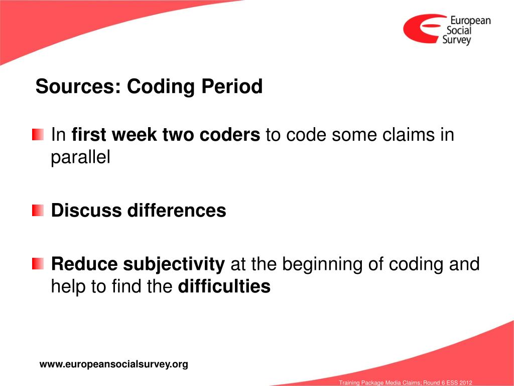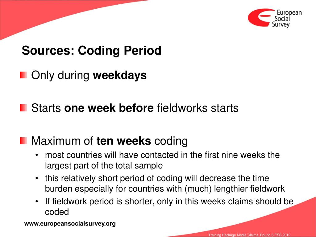 Sources: Coding Period • Onlyduringweekdays • Starts one week beforefieldworks starts • Maximum of ten weeks coding • most countries will have contacted in the first nine weeks the largest part of the total sample • this relatively short period of coding will decrease the time burden especially for countries with (much) lengthier fieldwork • If fieldwork period is shorter, only in this weeks claims should be coded