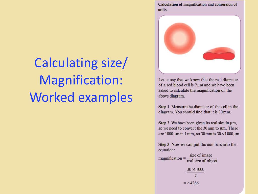 Magnification and scale bars • You will often need to calculate the actual size of a specimen/ component of a cell from a microscope image, or a photograph/micrograph • The first step is to ensure that all parts of your calculation have the same units!! Magnification = size of image actual size of specimen