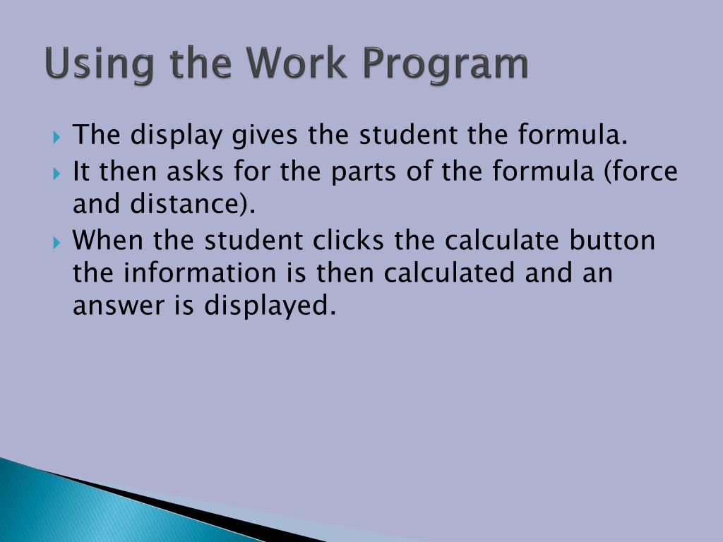 Using the Work Program • The display gives the student the formula. • It then asks for the parts of the formula (force and distance). • When the student clicks the calculate button the information is then calculated and an answer is displayed.