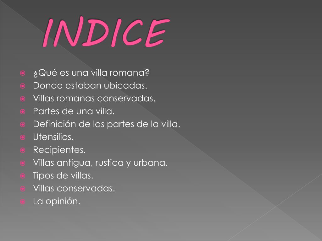 INDICE • ¿Qué es una villa romana? • Donde estaban ubicadas. • Villas romanas conservadas. • Partes de una villa. • Definición de las partes de la villa. • Utensilios. • Recipientes. • Villas antigua, rustica y urbana. • Tipos de villas. • Villas conservadas. • La opinión.