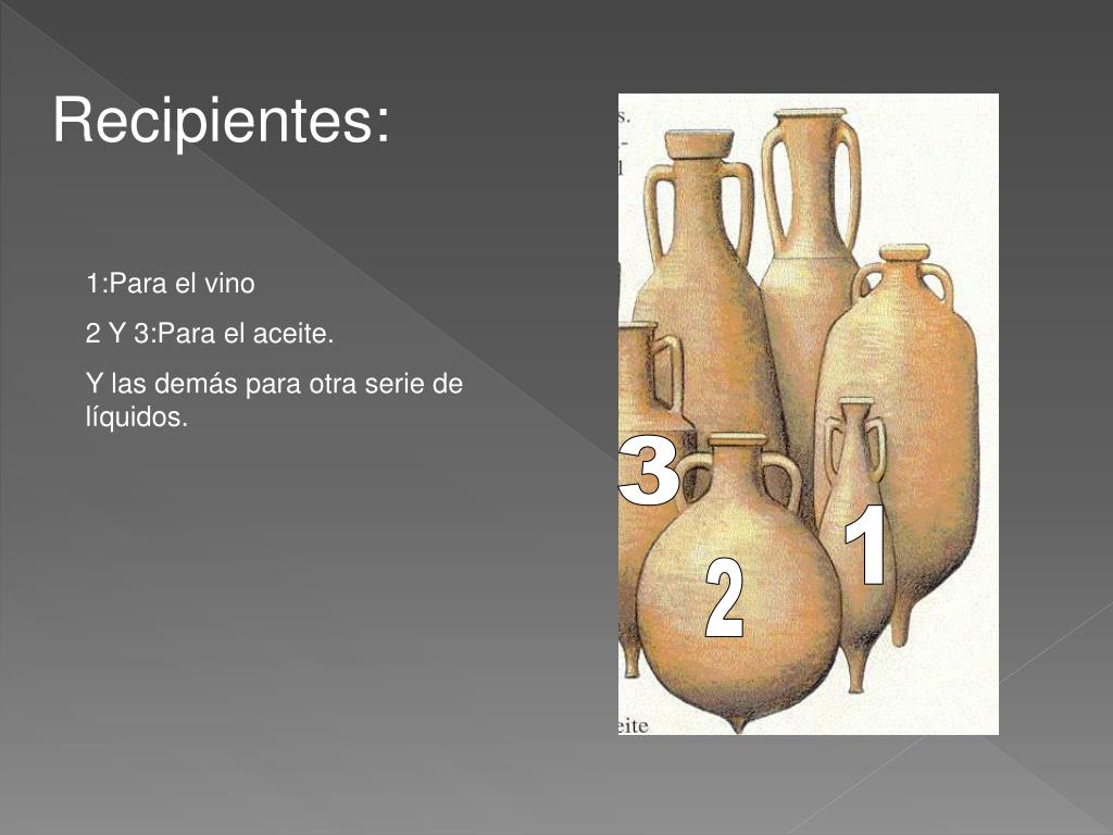 Recipientes: 1:Para el vino 2 Y 3:Para el aceite. Y las demás para otra serie de líquidos. 3 1 2