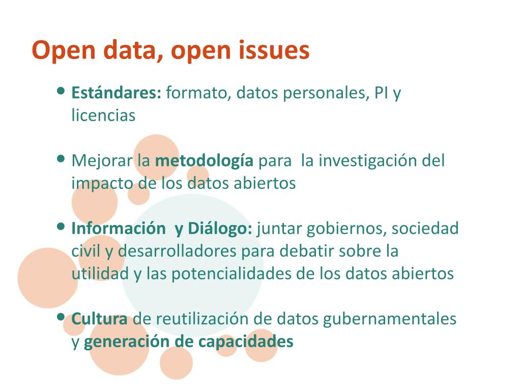Estándares: formato, datos personales, PI y licencias • Mejorar la metodología para la investigación del impacto de los datos abiertos • Información y Diálogo: juntar gobiernos, sociedad civil y desarrolladores para debatir sobre la utilidad y las potencialidades de los datos abiertos • Cultura de reutilización de datos gubernamentales y generación de capacidades Open data, open issues
