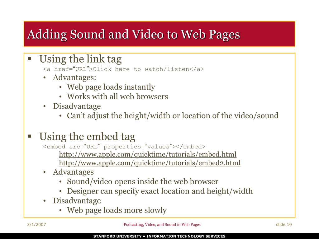 Streaming Media – Servers: Using Others’s Options For Storing Streaming Media Use someone else’s servers: • Stanford Streaming Media: http://www.stanford.edu/services/streaming/ • YouTube: http://www.youtube.com/ • GoFish: http://www.gofish.com/ • GUBA: http://www.guba.com/ • OurMedia: http://www.ourmedia.org/ and http://www.archive.org/ Podcasting, Video, and Sound in Web Pages