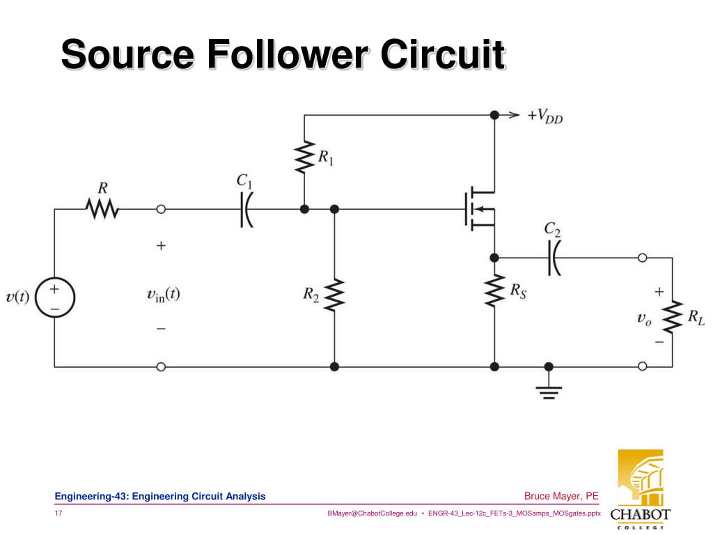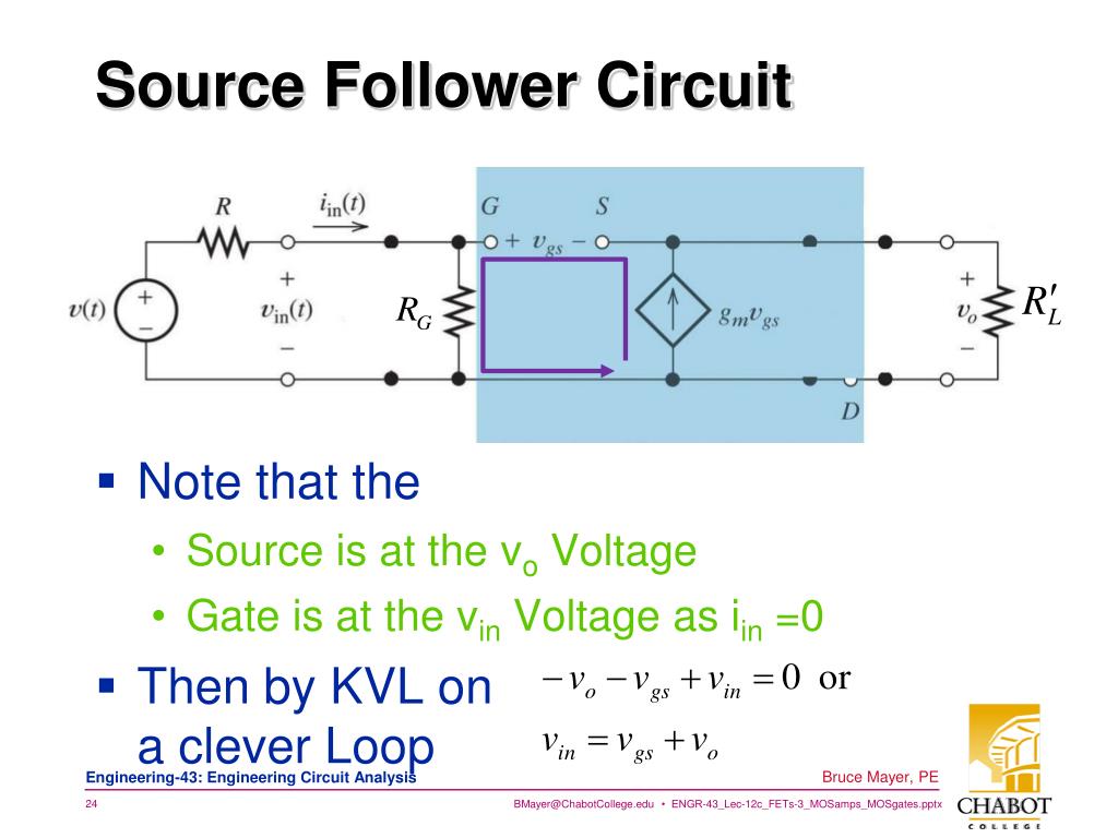 Source Follower Circuit • Note that the • Source is at the vo Voltage • Gate is at the vin Voltage as iin =0 • Then by KVL on a clever Loop