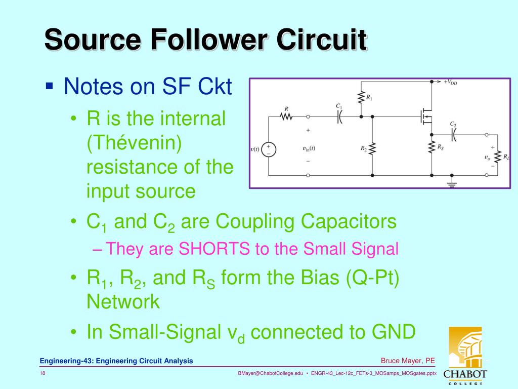 Source Follower Circuit • Notes on SF Ckt • R is the internal (Thévenin)resistance of the input source • C1 and C2 are Coupling Capacitors • They are SHORTS to the Small Signal • R1, R2, and RS form the Bias (Q-Pt) Network • In Small-Signal vd connected to GND