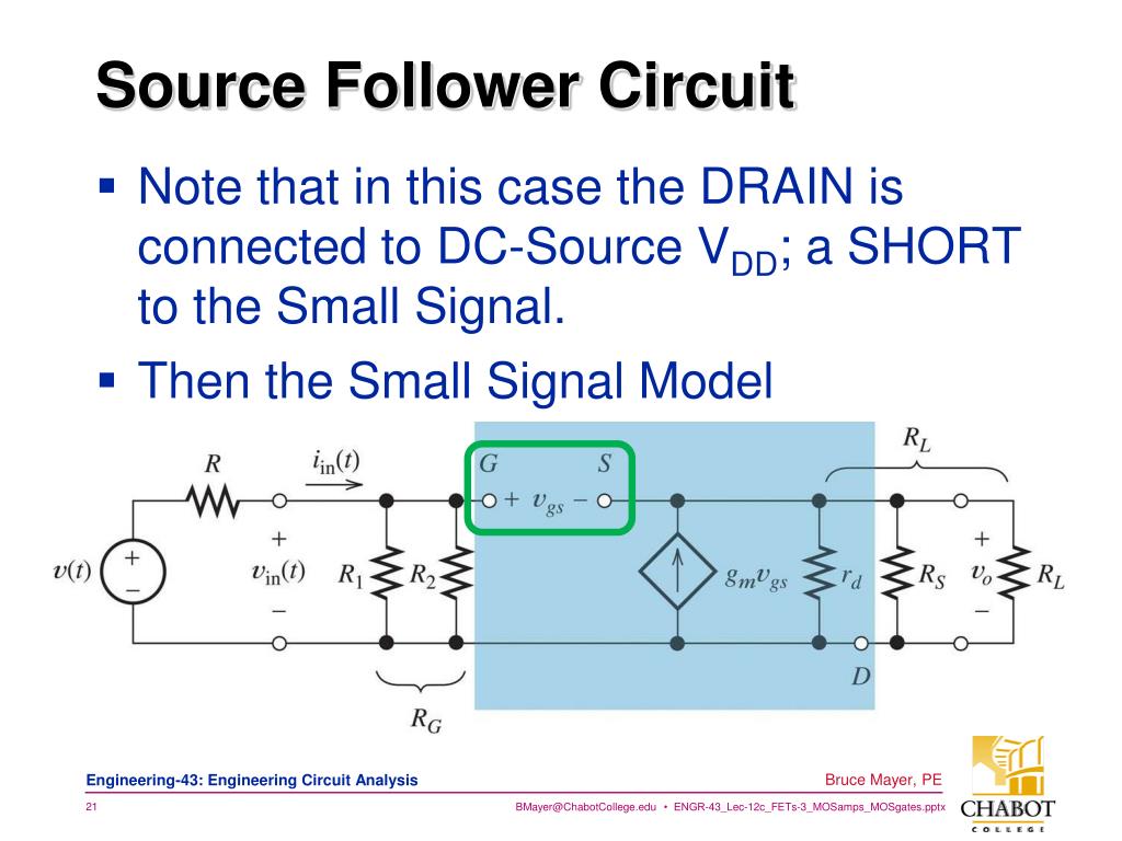 Source Follower Circuit • Note that in this case the DRAIN is connected to DC-Source VDD; a SHORT to the Small Signal. • Then the Small Signal Model