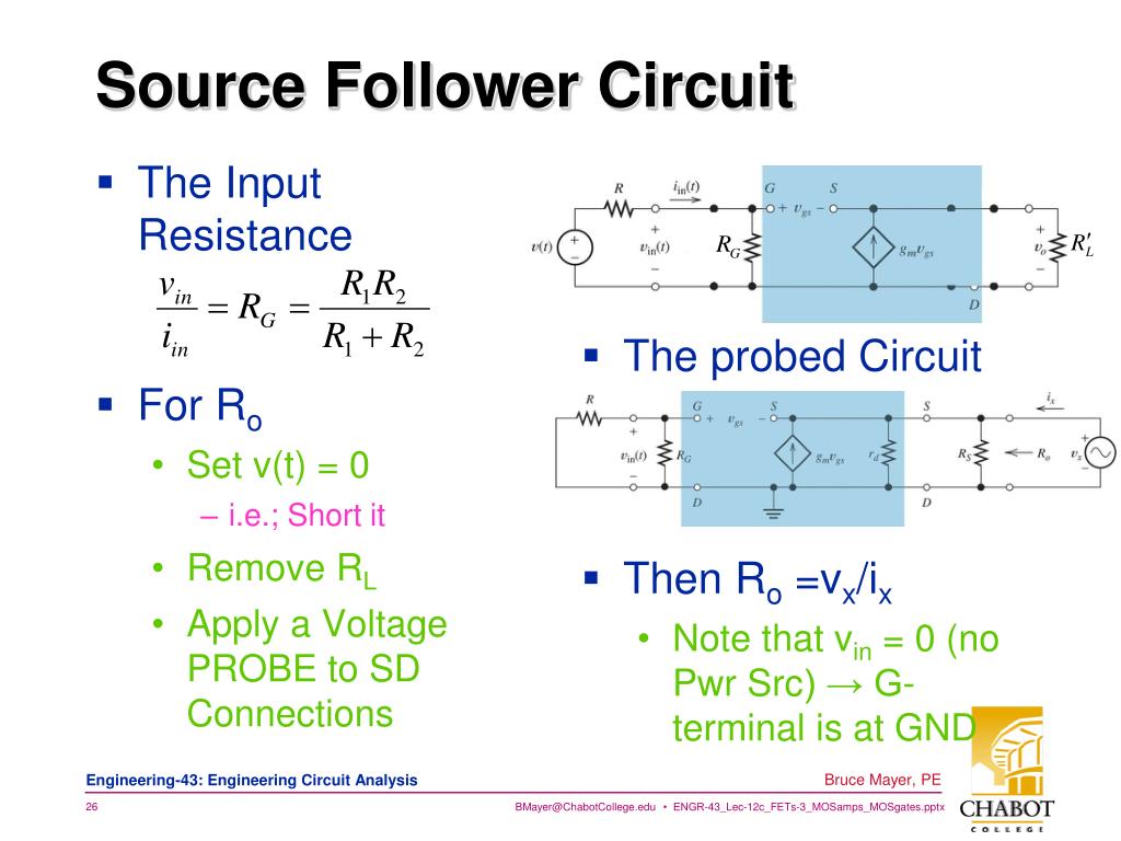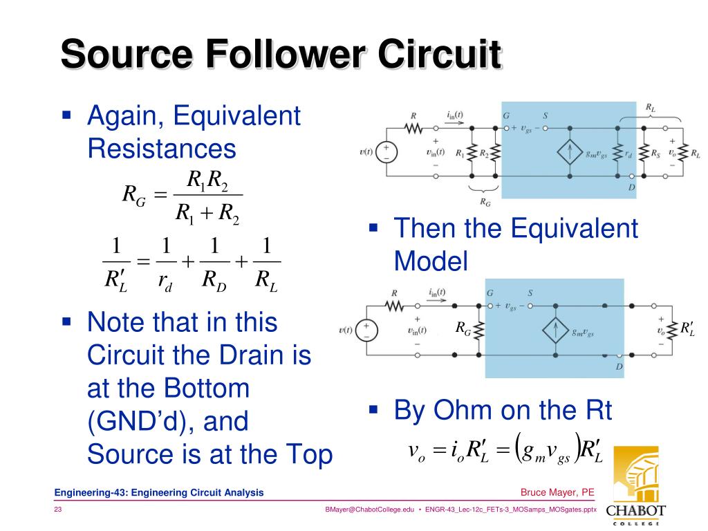 Source Follower Circuit • Again, Equivalent Resistances • Note that in this Circuit the Drain is at the Bottom (GND’d), and Source is at the Top • Then the Equivalent Model • By Ohm on the Rt