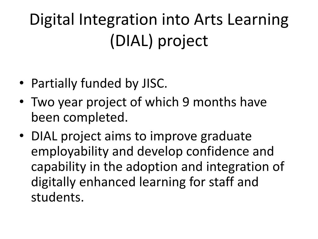 Digital Integration into Arts Learning (DIAL) project • Partially funded by JISC. • Two year project of which 9 months have been completed. • DIAL project aims to improve graduate employability and develop confidence and capability in the adoption and integration of digitally enhanced learning for staff and students.