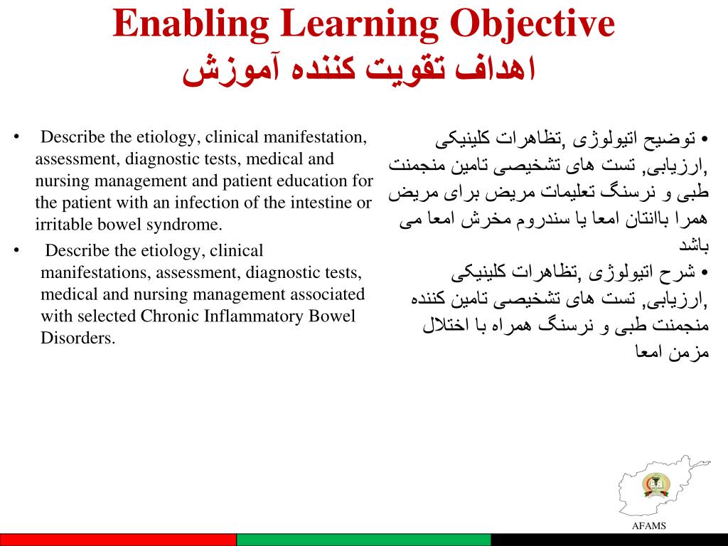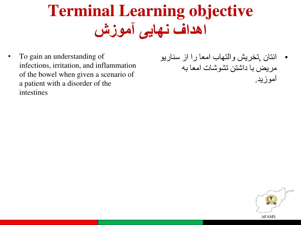 Infection, Irritation, and Inflammation of the Bowels انتان ,تخریش والتهاب امعا Learning Objective: Nursing students will gain an understanding of infections, irritation, and inflammation of the bowels. Estimated Time to Complete: 240 minutes. هدف آموزش: شاگردان نرسنگ دانش انتان ,تخریش والتهاب امعا را دربدست خواهند آورد. زمان معین شده برای تکمیل این لکچر: 240دقیقه. AFAMS