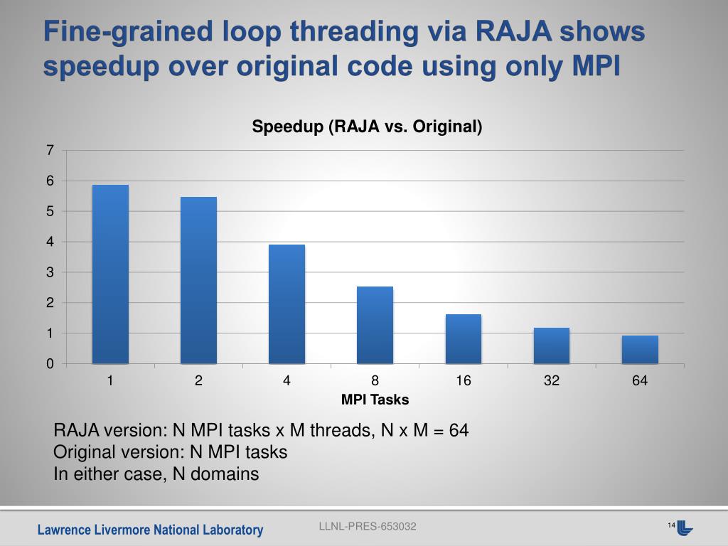 Fine-grained loop threading via RAJA shows speedup over original code using only MPI RAJA version: N MPI tasks x M threads, N x M = 64 Original version: N MPI tasks In either case, N domains