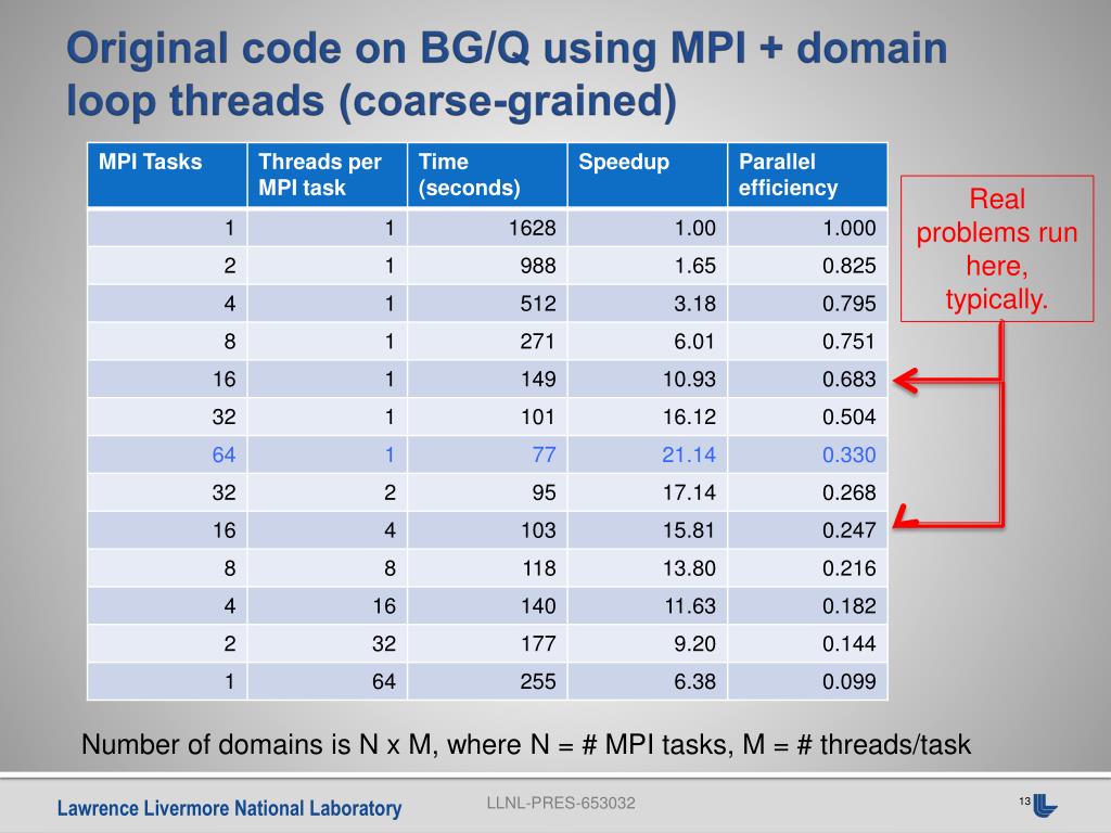 Original code on BG/Q using MPI + domain loop threads (coarse-grained) Real problems run here, typically. Number of domains is N x M, where N = # MPI tasks, M = # threads/task