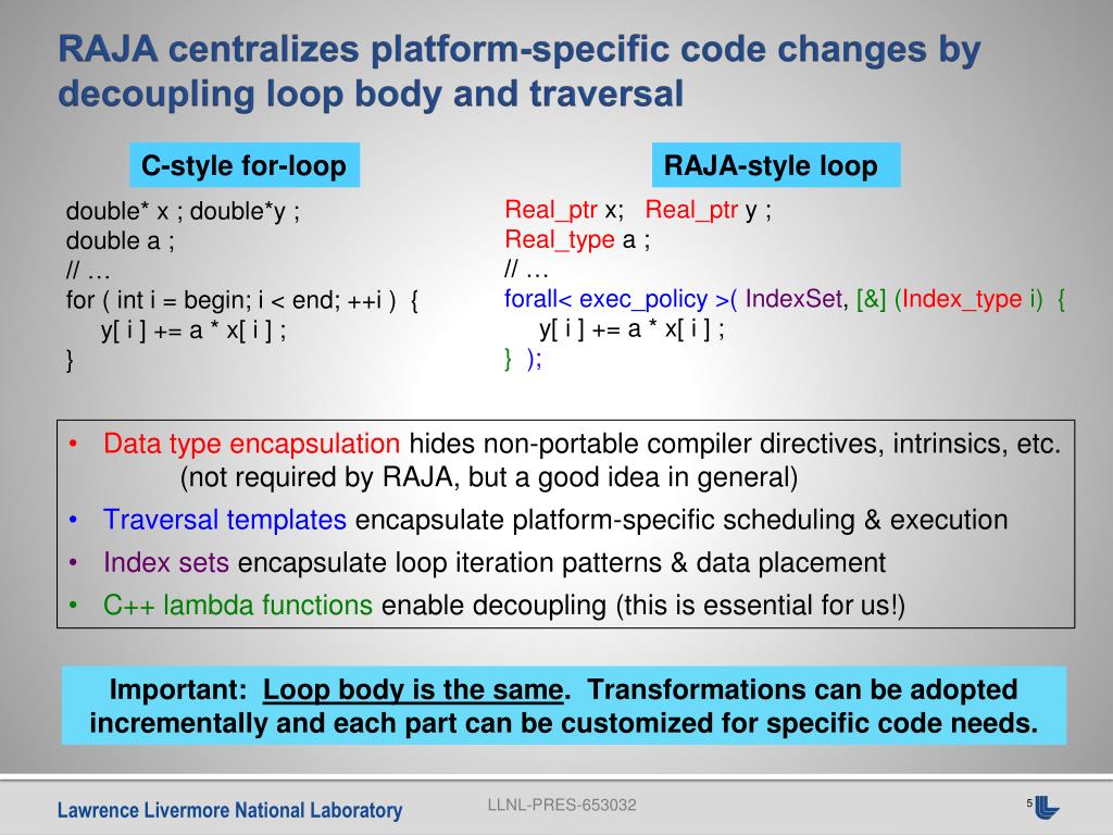 “RAJA” is a potential path forward for our multiphysics applications at LLNL • We need algorithms & programming styles that: • Can express various forms of parallelism • Enable high performance portably • We can explore in our codes incrementally • There is no clear “best choice” for future PM/language. • RAJA is based on standard C++ (we rely on already) • It supports constructs & extends concepts used heavily in LLNL codes • It can be added to codes incrementally & used selectively • It allows various PMs “under the covers”– it does not wed a code to a particular technology • It is lightweight and offers developers customizable implementation choices