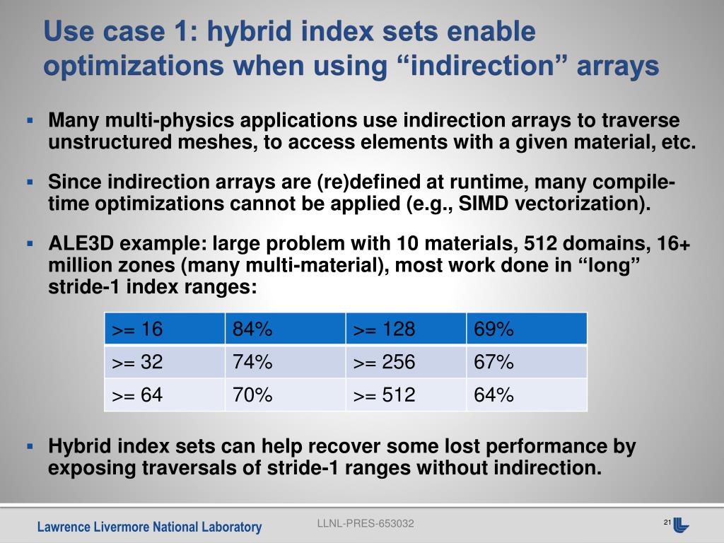 Use case 1: hybrid index sets enable optimizations when using “indirection” arrays Many multi-physics applications use indirection arraysto traverse unstructured meshes, to access elements with a given material, etc. Since indirection arrays are (re)defined at runtime, many compile-time optimizations cannot be applied (e.g., SIMD vectorization). ALE3D example: large problem with 10 materials, 512 domains, 16+ million zones (many multi-material), most work done in “long” stride-1 index ranges: Hybrid index sets can help recover some lost performance by exposing traversals of stride-1 ranges without indirection.