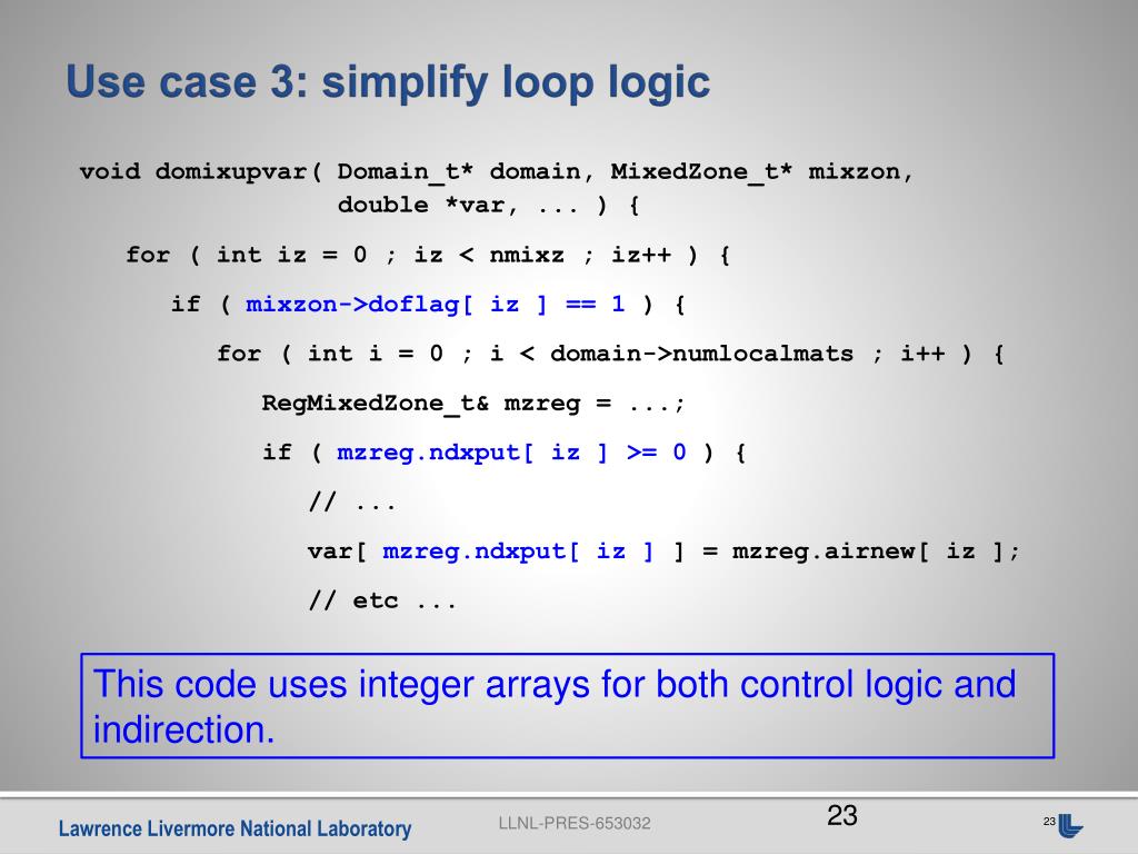 Use case 3: simplify loop logic This code uses integer arraysfor both control logic and indirection. void domixupvar( Domain_t* domain, MixedZone_t* mixzon, double *var, ... ) { for ( int iz = 0 ; iz < nmixz ; iz++ ) { if ( mixzon->doflag[ iz ] == 1 ) { for ( int i = 0 ; i < domain->numlocalmats ; i++ ) { RegMixedZone_t& mzreg = ...; if ( mzreg.ndxput[ iz ] >= 0 ) { // ... var[ mzreg.ndxput[ iz ] ] = mzreg.airnew[ iz ]; // etc ...