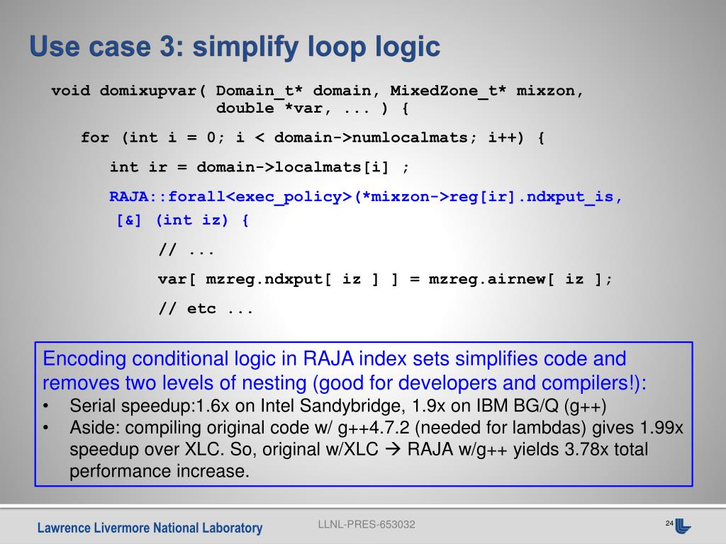 Use case 3: simplify loop logic • Encoding conditional logic in RAJA index sets simplifies code and removes two levels of nesting (good for developers and compilers!): • Serial speedup:1.6x on Intel Sandybridge, 1.9x on IBM BG/Q (g++) • Aside: compiling original code w/ g++4.7.2 (needed for lambdas) gives 1.99x speedup over XLC. So, original w/XLC RAJA w/g++ yields 3.78x total performance increase. void domixupvar( Domain_t* domain, MixedZone_t* mixzon, double *var, ... ) { for (inti = 0; i < domain->numlocalmats; i++) { int ir = domain->localmats[i] ; RAJA::forall<exec_policy>(*mixzon->reg[ir].ndxput_is, [&] (intiz) { // ... var[ mzreg.ndxput[ iz ] ] = mzreg.airnew[ iz ]; // etc ...