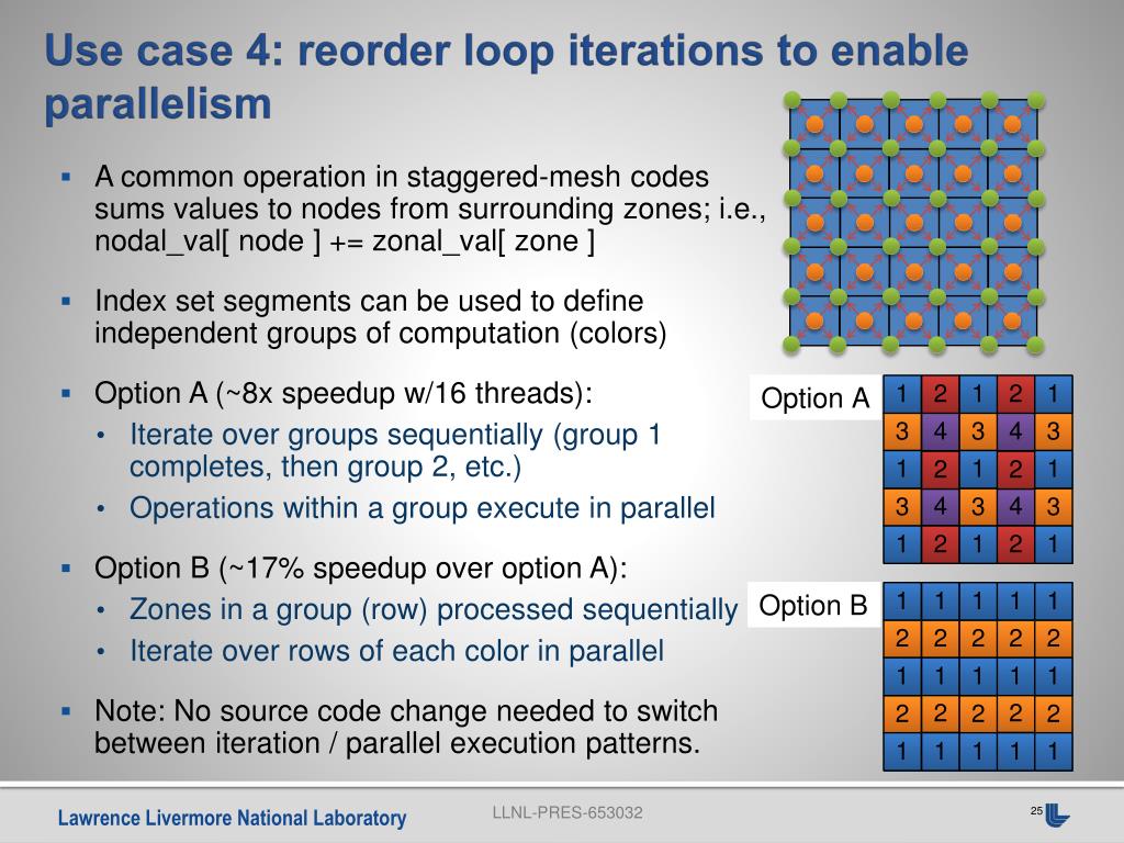 Use case 4: reorder loop iterations to enable parallelism 1 1 1 2 1 1 1 2 1 1 2 3 2 4 3 2 4 2 2 3 Option A 1 1 1 1 1 1 1 1 2 2 2 4 2 4 2 3 2 3 3 2 1 1 2 1 1 1 1 2 1 1 Option B • A common operation in staggered-mesh codes sums values to nodes from surrounding zones; i.e., nodal_val[ node ] += zonal_val[ zone ] • Index set segments can be used to define independent groups of computation (colors) • Option A (~8x speedup w/16 threads): • Iterate over groups sequentially (group 1 completes, then group 2, etc.) • Operations within a group execute in parallel • Option B (~17% speedup over option A): • Zones in a group (row) processed sequentially • Iterate over rows of each color in parallel • Note: No source code change needed to switch between iteration / parallel execution patterns.