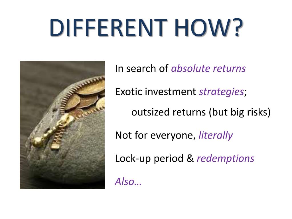DIFFERENT HOW? In search of absolute returns Exotic investment strategies; outsized returns (but big risks) Not for everyone, literally Lock-up period & redemptions Also…