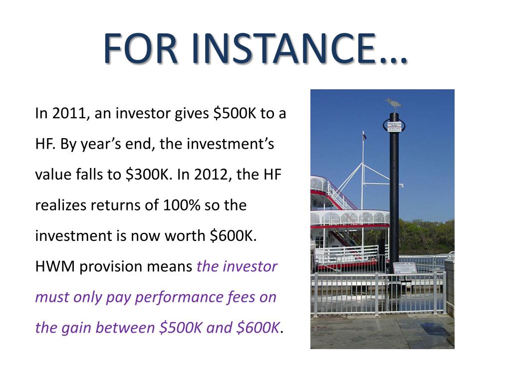 FOR INSTANCE… In 2011, an investor gives $500K to a HF. By year’s end, the investment’s value falls to $300K. In 2012, the HF realizes returns of 100% so the investment is now worth $600K. HWM provision means the investor must only pay performance fees on the gain between $500K and $600K.