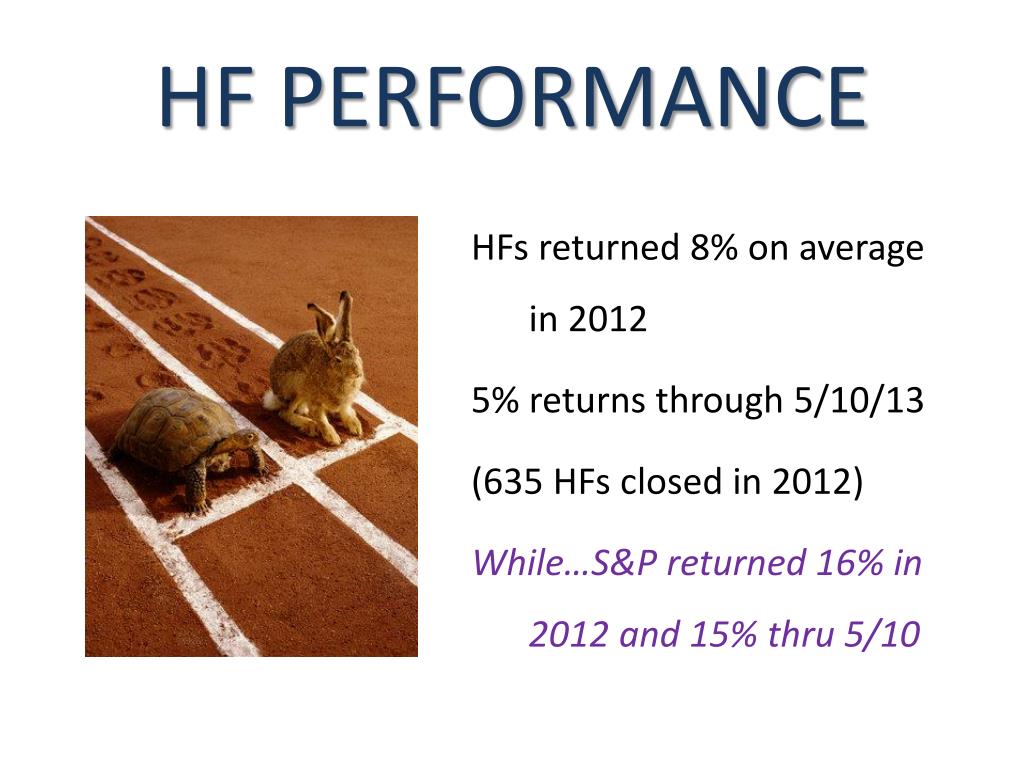 HF PERFORMANCE HFs returned 8% on average in 2012 5% returns through 5/10/13 (635 HFs closed in 2012) While…S&P returned 16% in 2012 and 15% thru 5/10