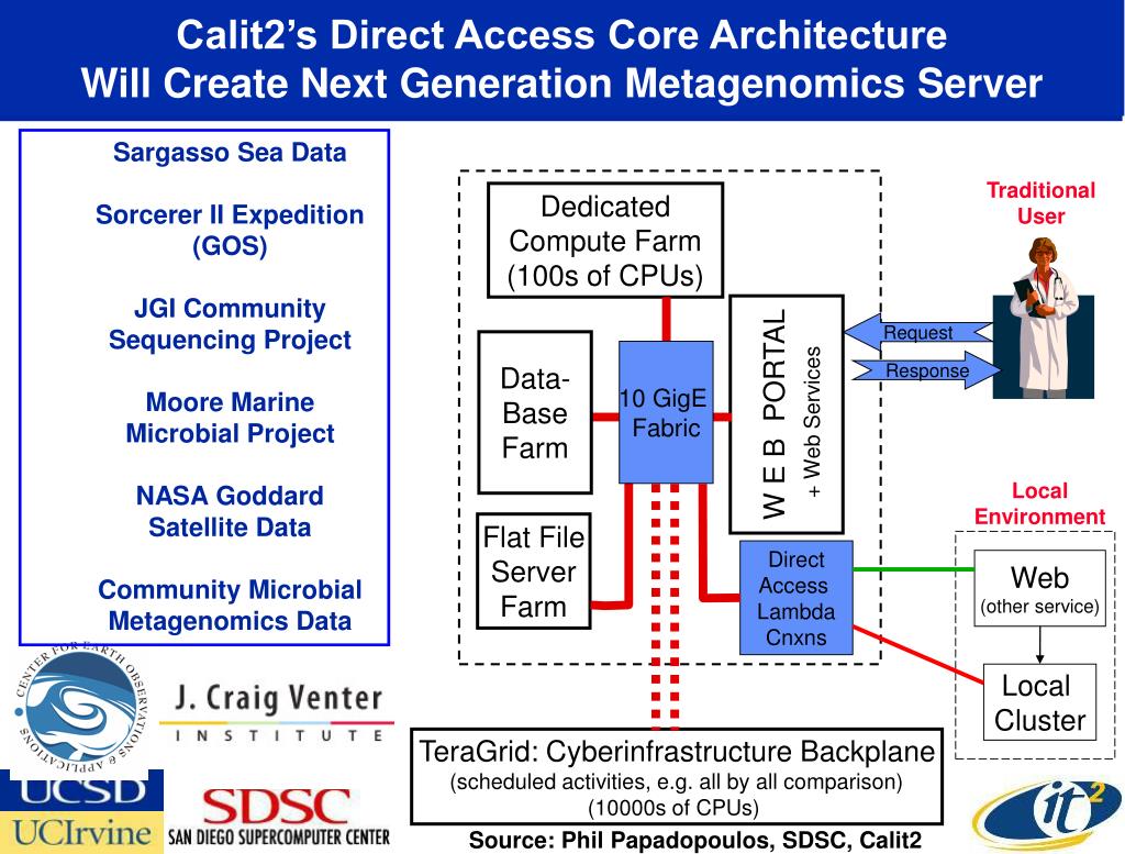 Calit2 Intends to Jump BeyondTraditional Web-Accessible Databases BIRN PDB NCBI Genbank W E B PORTAL (pre-filtered, queries metadata) Data Backend (DB, Files) Request Response + many others Source: Phil Papadopoulos, SDSC, Calit2