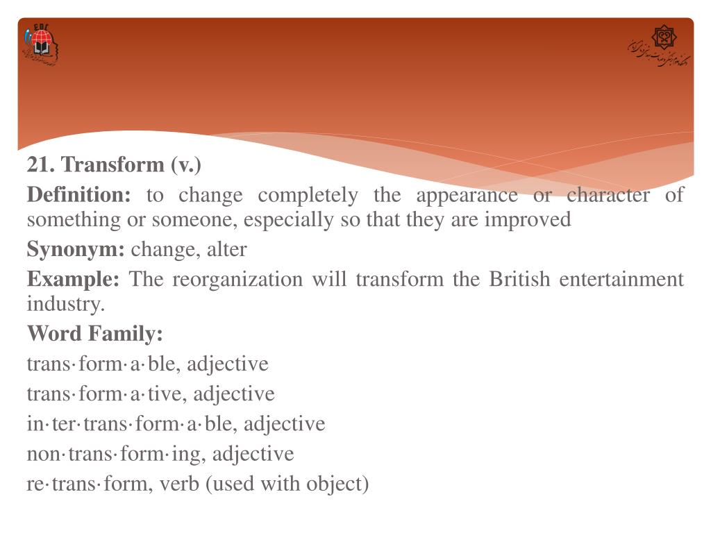 21. Transform (v.) Definition: to change completely the appearance or character of something or someone, especially so that they are improved Synonym: change, alter Example: The reorganization will transform the British entertainment industry. Word Family: trans·form·a·ble, adjective trans·form·a·tive, adjective in·ter·trans·form·a·ble, adjective non·trans·form·ing, adjective re·trans·form, verb (used with object)