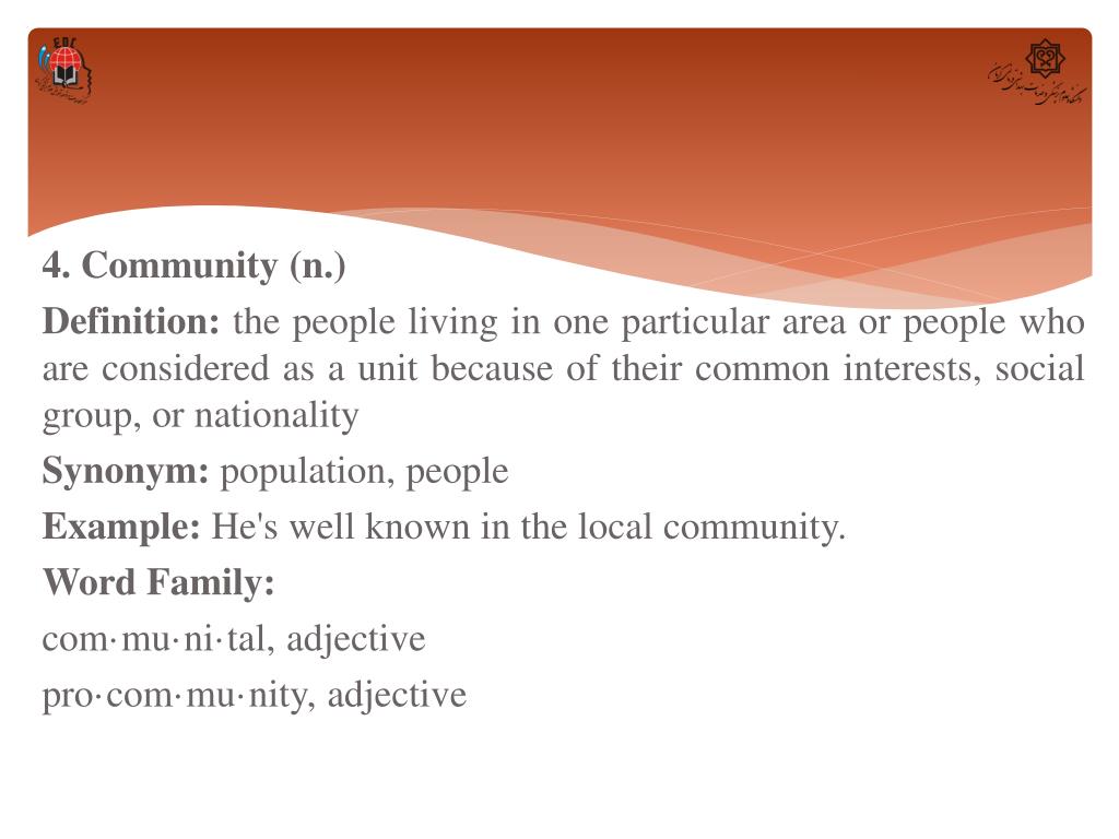4. Community (n.) Definition:the people living in one particular area or people who are considered as a unit because of their common interests, social group, or nationality Synonym: population, people Example: He's well known in the local community. Word Family: com·mu·ni·tal, adjective pro·com·mu·nity, adjective