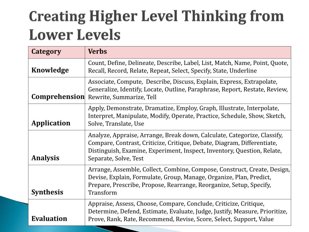 Synthesis • Arrange • Assemble • Collect • Combine • Compose • Construct • Create • Design • Devise • Explain • Formulate • Group • Manage • Organize • Plan • Predict • Prepare • Prescribe • Propose • Rearrange • Reorganize • Setup • Specify • Transform