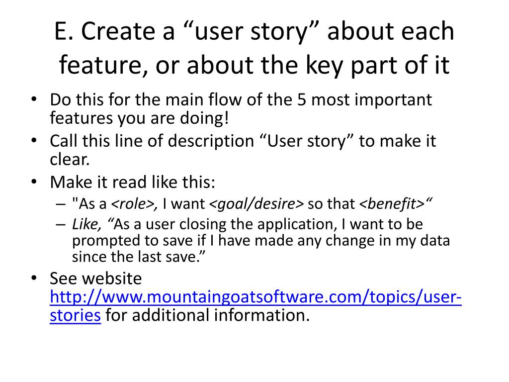 E. Create a “user story” about each feature, or about the key part of it • Do this for the main flow of the 5 most important features you are doing! • Call this line of description “User story” to make it clear. • Make it read like this: • "As a <role>, I want <goal/desire> so that <benefit>“ • Like, “As a user closing the application, I want to be prompted to save if I have made any change in my data since the last save.” • See website http://www.mountaingoatsoftware.com/topics/user-stories for additional information.