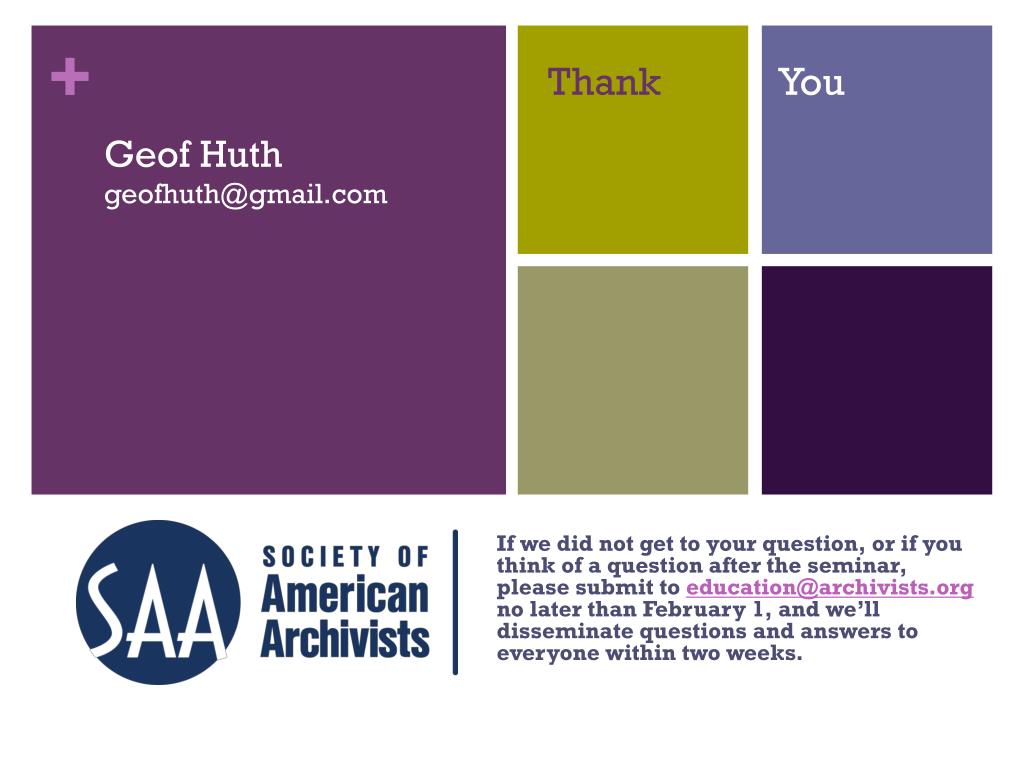 Thank You Geof Huthgeofhuth@gmail.com If we did not get to your question, or if you think of a question after the seminar, please submit to education@archivists.org no later than February 1, and we’ll disseminate questions and answers to everyone within two weeks.
