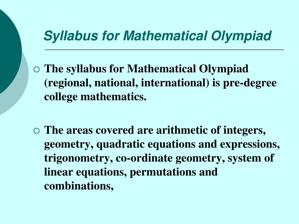 Syllabus for Mathematical Olympiad • The syllabus for Mathematical Olympiad (regional, national, international) is pre-degree college mathematics. • The areas covered are arithmetic of integers, geometry, quadratic equations and expressions, trigonometry, co-ordinate geometry, system of linear equations, permutations and combinations,